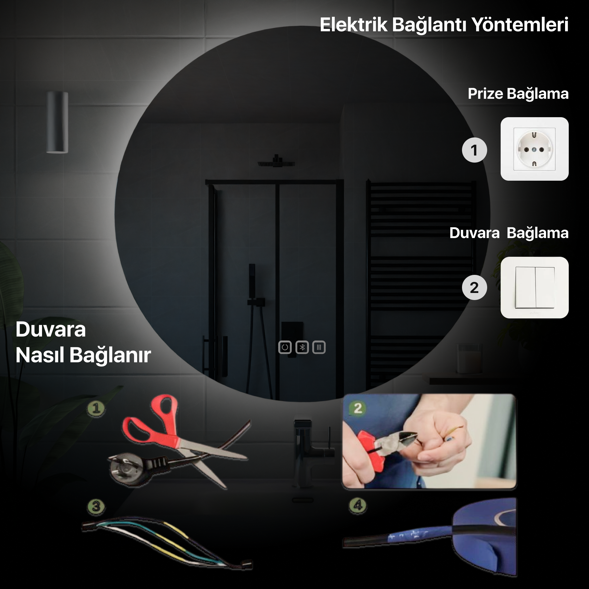 Kumlamasız Bluetoothlu, Buğu Çözücülü, Dokunmatik LEDli Yuvarlak Ayna - Gün Işığı