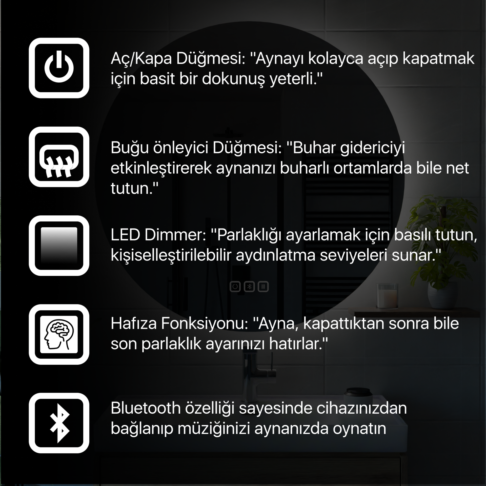 Bluetooth hoparlör sistemi, aynanın üzerindeki Bluetooth simgesi bulunan dokunmatik tuş ile aktif hale getirilir. Açıldıktan sonra telefonunuzdan Bluetooth bağlantısını gerçekleştirerek, müziklerinizi ve sesli içeriklerinizi aynamızın hoparlörlerinden daha yüksek ve kaliteli bir şekilde dinleyebilirsiniz.