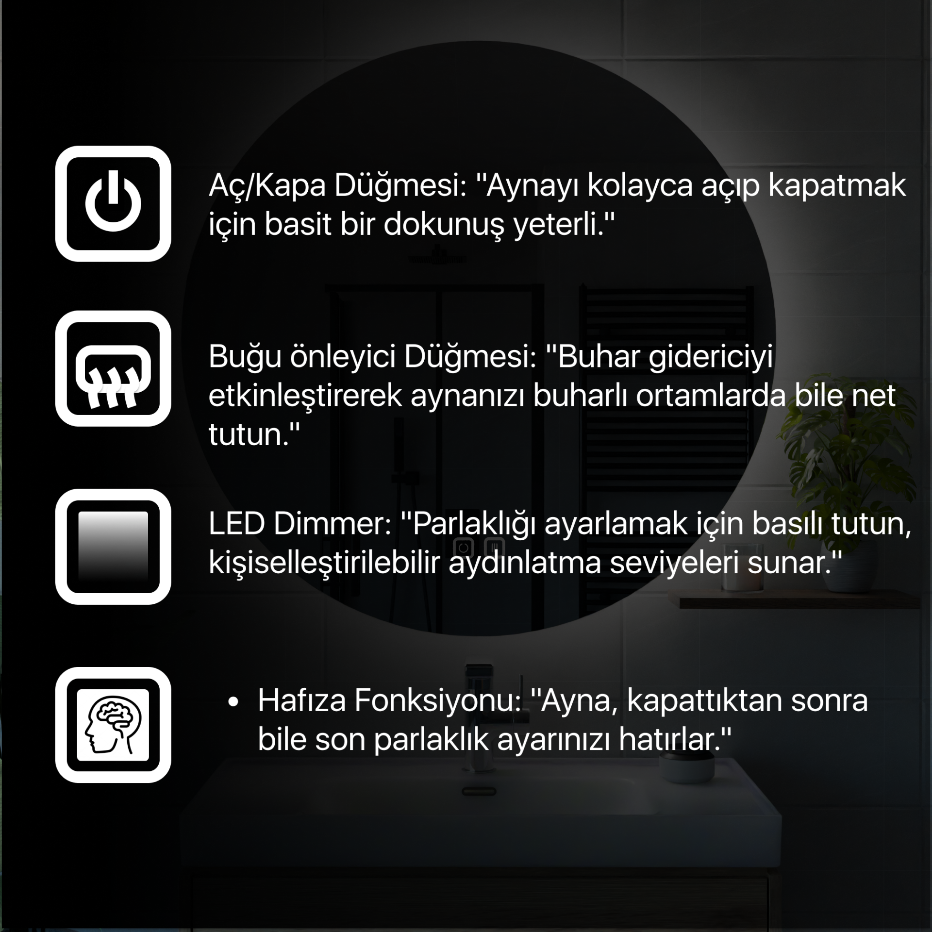 Arven Grup Buğu Önleyicili, dokunmatik tuşlu, LED Işık banyo ve makyaj aynası, şık tasarımı ve güçlü aydınlatması ile hem estetik hem de işlevselliği bir araya getiriyor. Dokunmatik tuşu sayesinde, ışık kontrolünü zahmetsizce sağlayabilirsiniz. Dokunmatik tuşun ışık ayarlama özelliği ile basılı tutarak ışık şiddetini kişiselleştirebilirsiniz. Buğu önleyici fonksiyon sayesinde duş sırasında bile aynanızın yüzeyinde oluşan yoğuşmayı engelleyerek her zaman net bir görüntü almanızı sağlar.