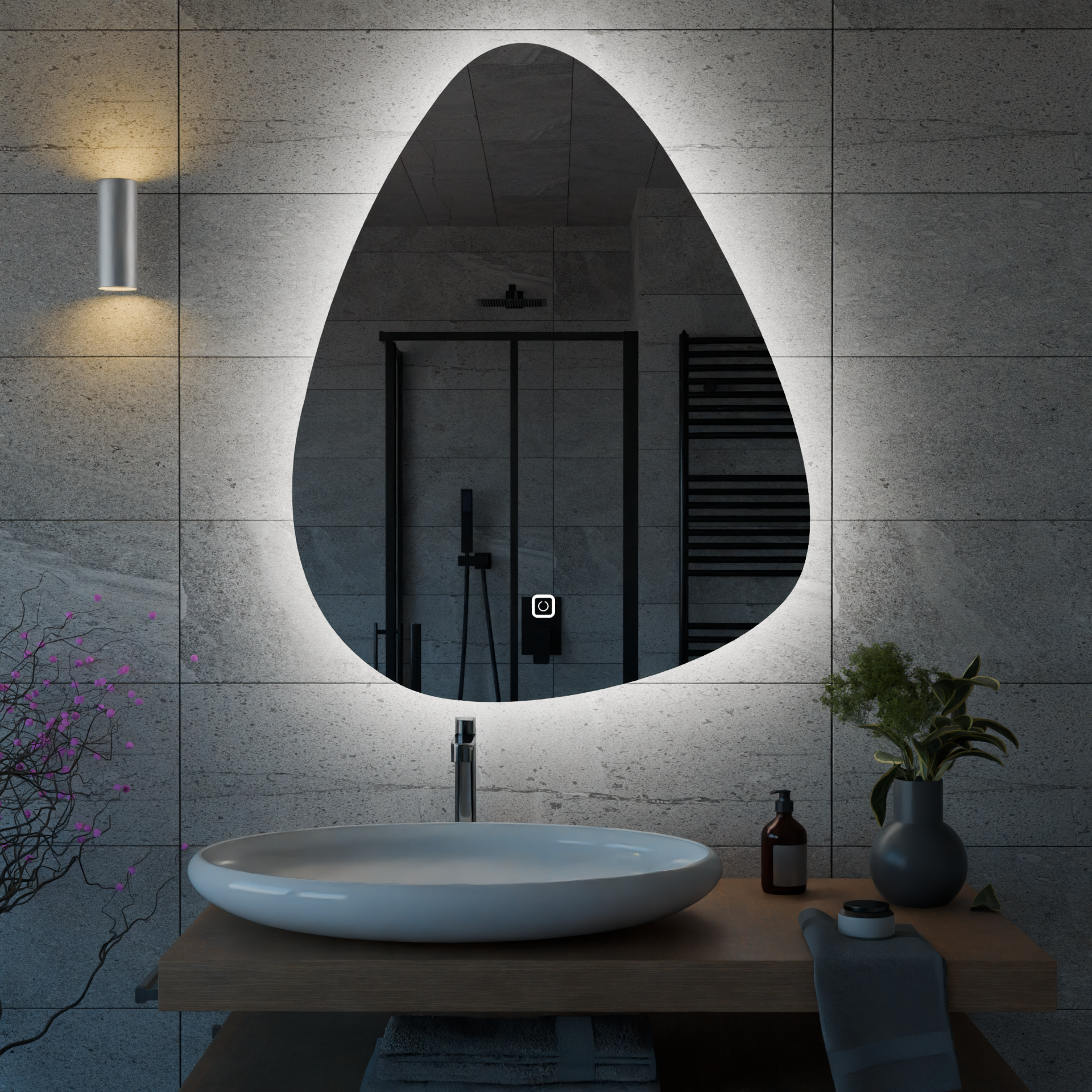 Kumlamasız Dokunmatik Tuşlu ve LED Işıklı Asimetrik Banyo Aynası - Beyaz Işık