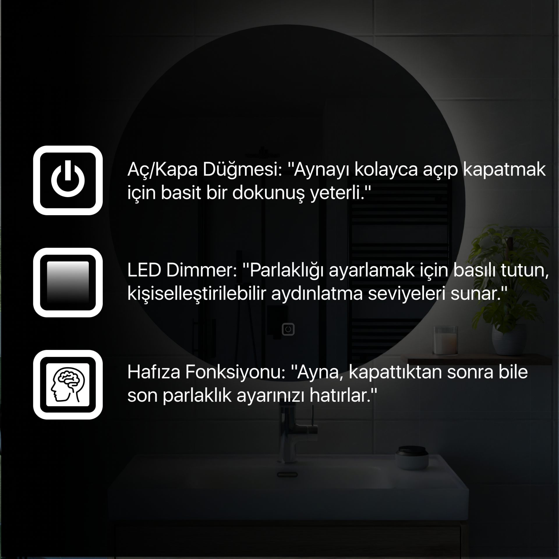 Arven Grup dokunmatik tuşlu LED’li banyo ve makyaj aynası, şık tasarımı ve güçlü aydınlatması ile hem estetik hem de işlevselliği bir araya getiriyor. Dokunmatik tuşu sayesinde, ışık kontrolünü zahmetsizce sağlayabilirsiniz. Dokunmatik tuşun ışık ayarlama özelliği ile dokunmatik tuşa basılı tutarak ışık ayarını yapabilirsiniz. 120 çipli LED teknolojisi sayesinde enerji tasarrufu sağlarken, üstün cam kalitesiyle doğal ve berrak bir yansıma sunar.